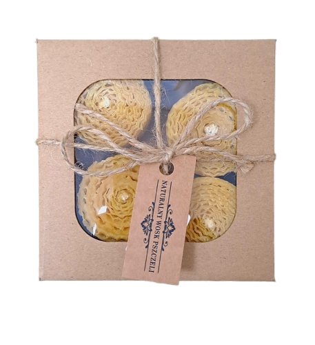 Unikatowy zestaw świec z węzy pszczelej w kształcie walca zapakowany w ozdobny kartonik, dzięki czemu jest idealny na prezent. Bazowym składnikiem świec, odlewanych ręcznie w pracowni w Sułkowicach, są plastry węzy o określonym kształcie. Węza pszczela naturalnego pochodzenia jest to szablon z komórkami wytłoczonymi na kształt plastra. Stanowi on element ula, który pomaga pszczołom budować stabilne i staranne plastry oraz zachować czystość. Świece z węzy powstają przez ręczne zwijanie plastrów naturalnego wosku pszczelego przez co zyskują ozdobną formę.